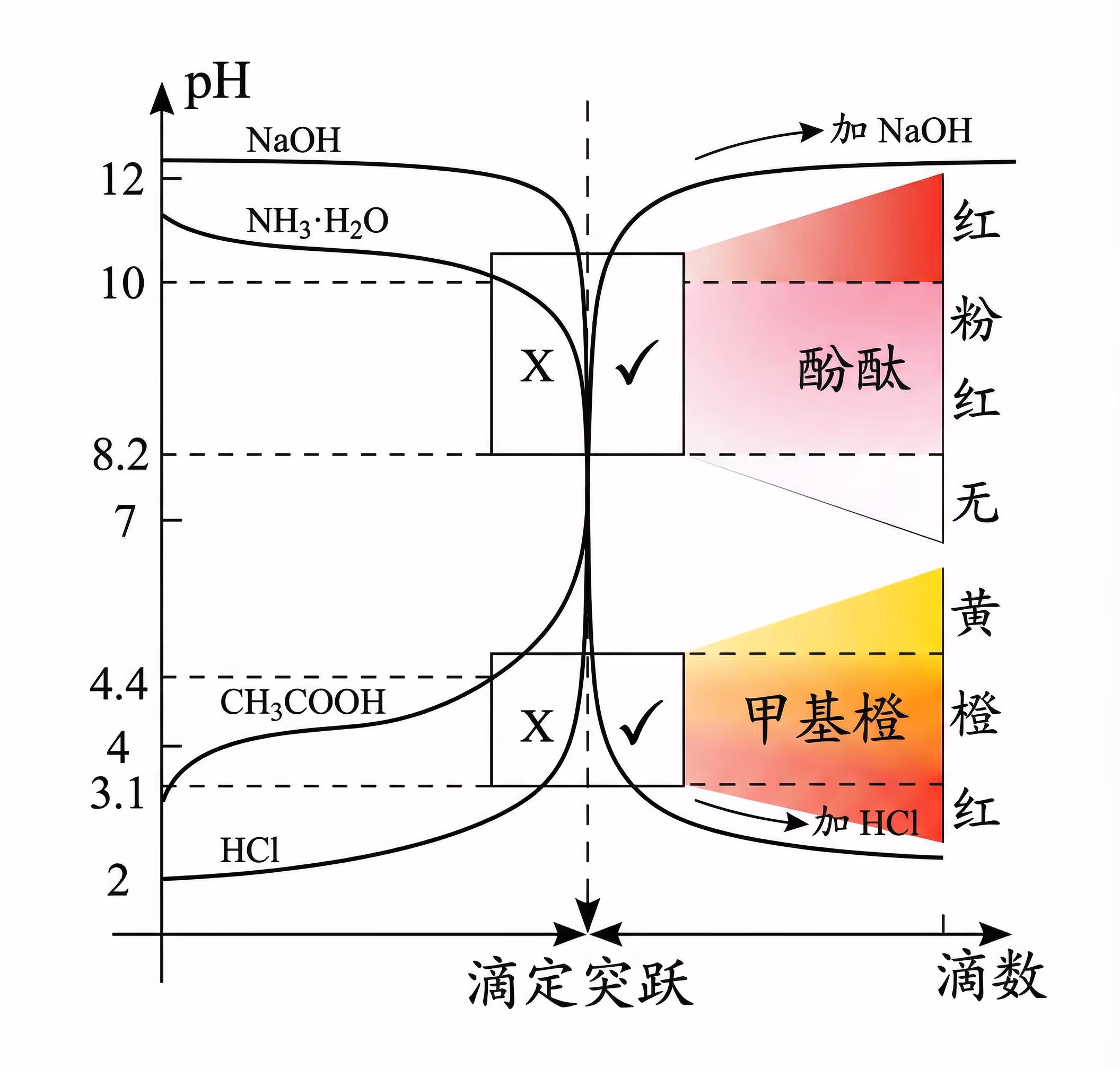 核心规律:统统都是“酸红碱黄”。首先,不要把它们分开背,甲基橙和甲基红在颜色变化的大方向上是完全一样的!